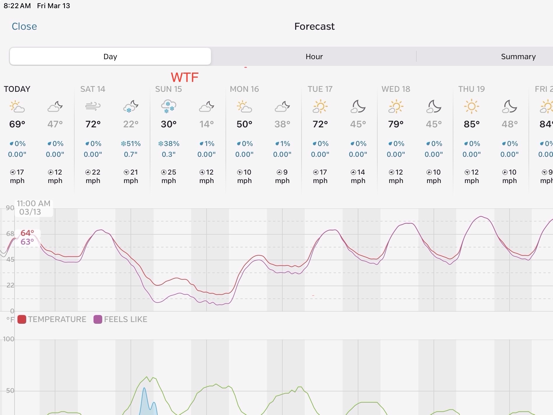 After a 50 degree swing on high/low temps this Saturday, a 30 degrees high with snow on Sunday. Then back into the 80’s by the end of the week.